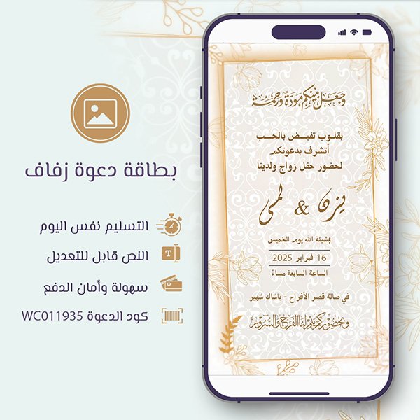 هذه البطاقة ليس مجرد دعوة، بل لمسة فنية تعبر عن حبكم ورقي حفل زفافكم. اجعل يومك الكبير مميزًا من البداية